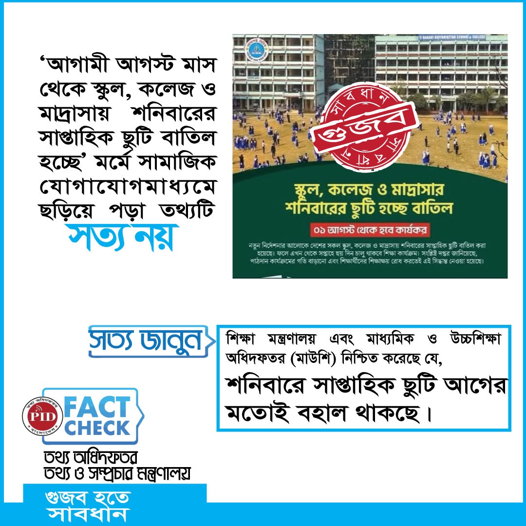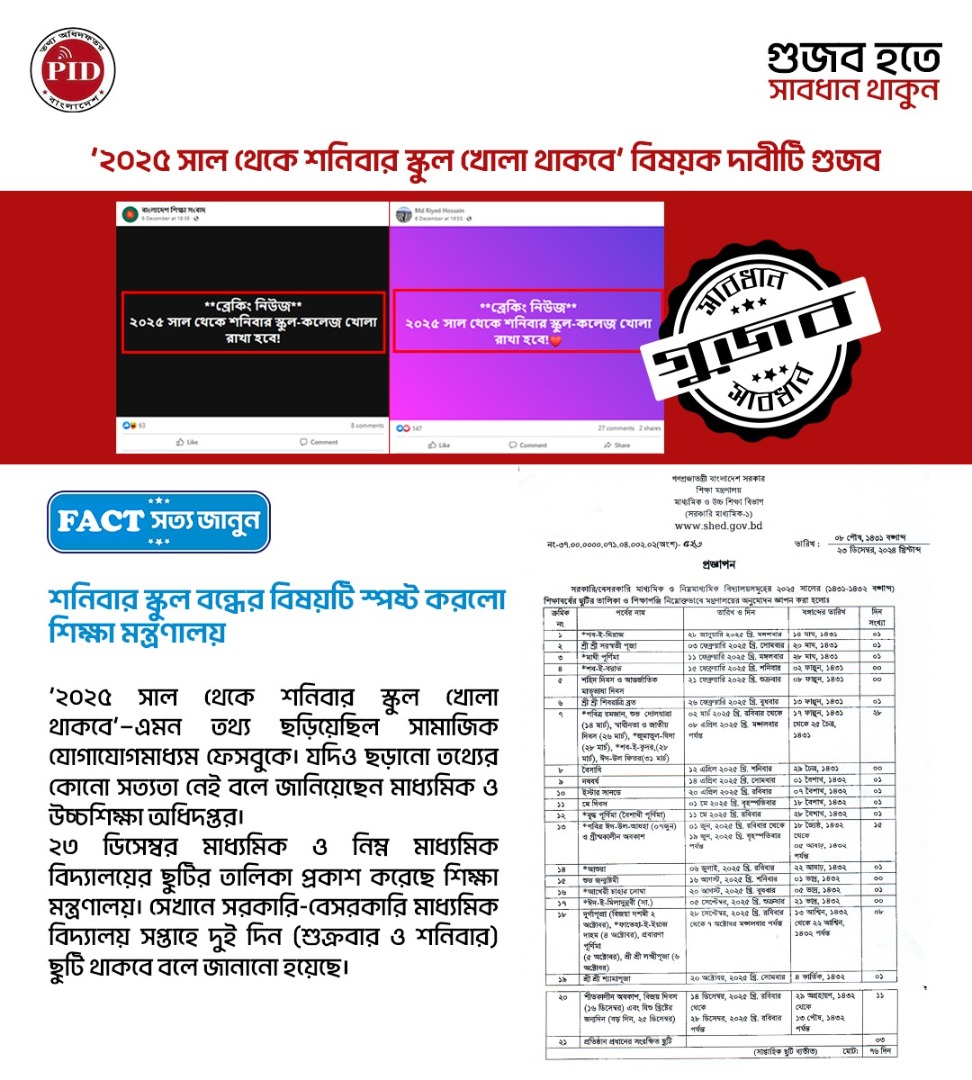 | ২৪/১২/২০২৪ | '২০২৫ সালে শনিবার স্কুল খোলা থাকবে' বিষয়টি গুজব | |
