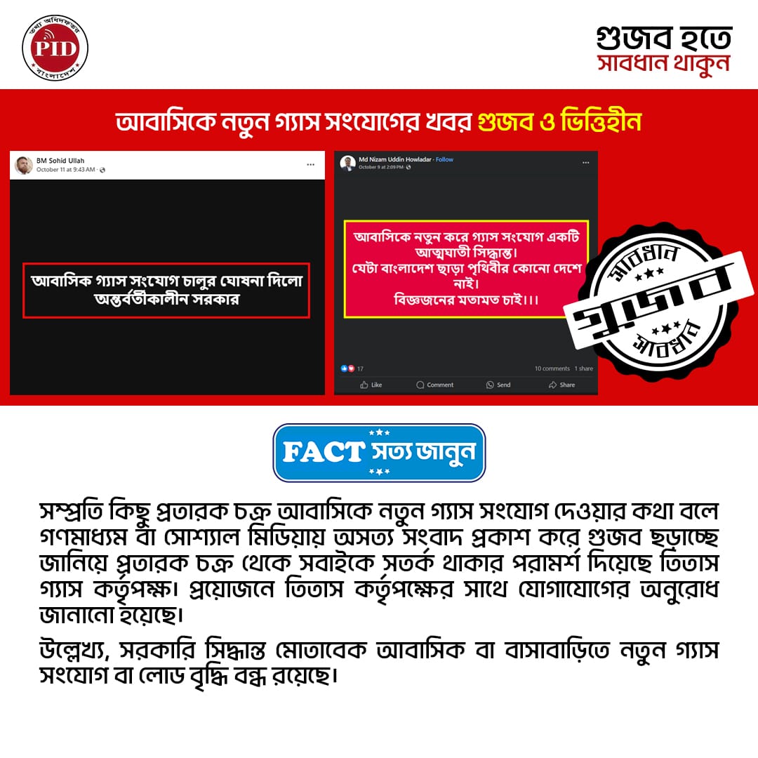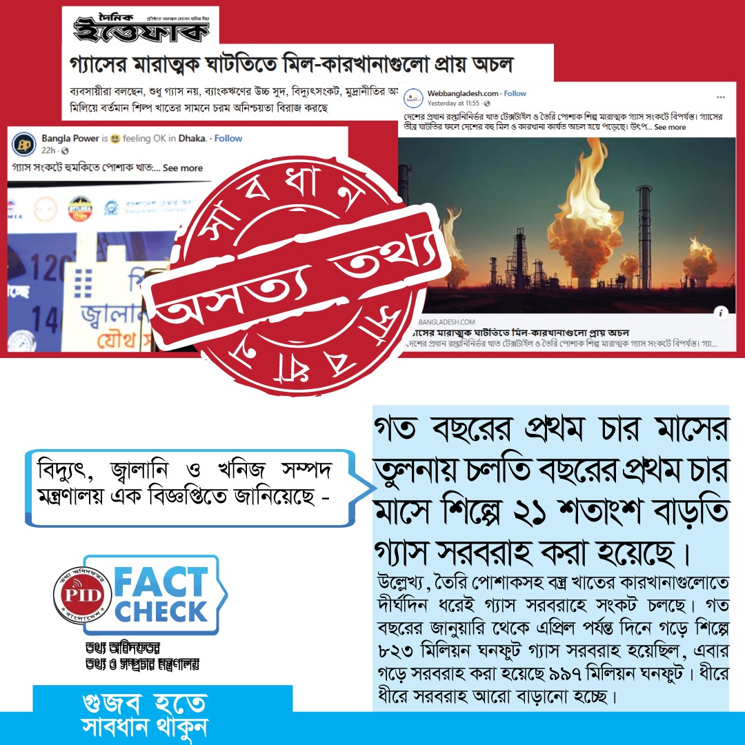 | ২৭/০৫/২০২৫ | কল-কারখানায় গ্যাসের সরবরাহ ঘিরে প্রচারিত গুজব | |