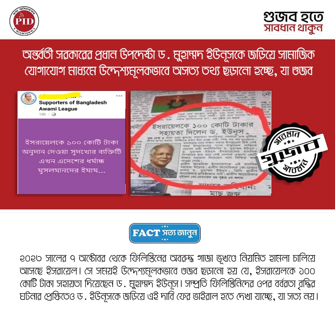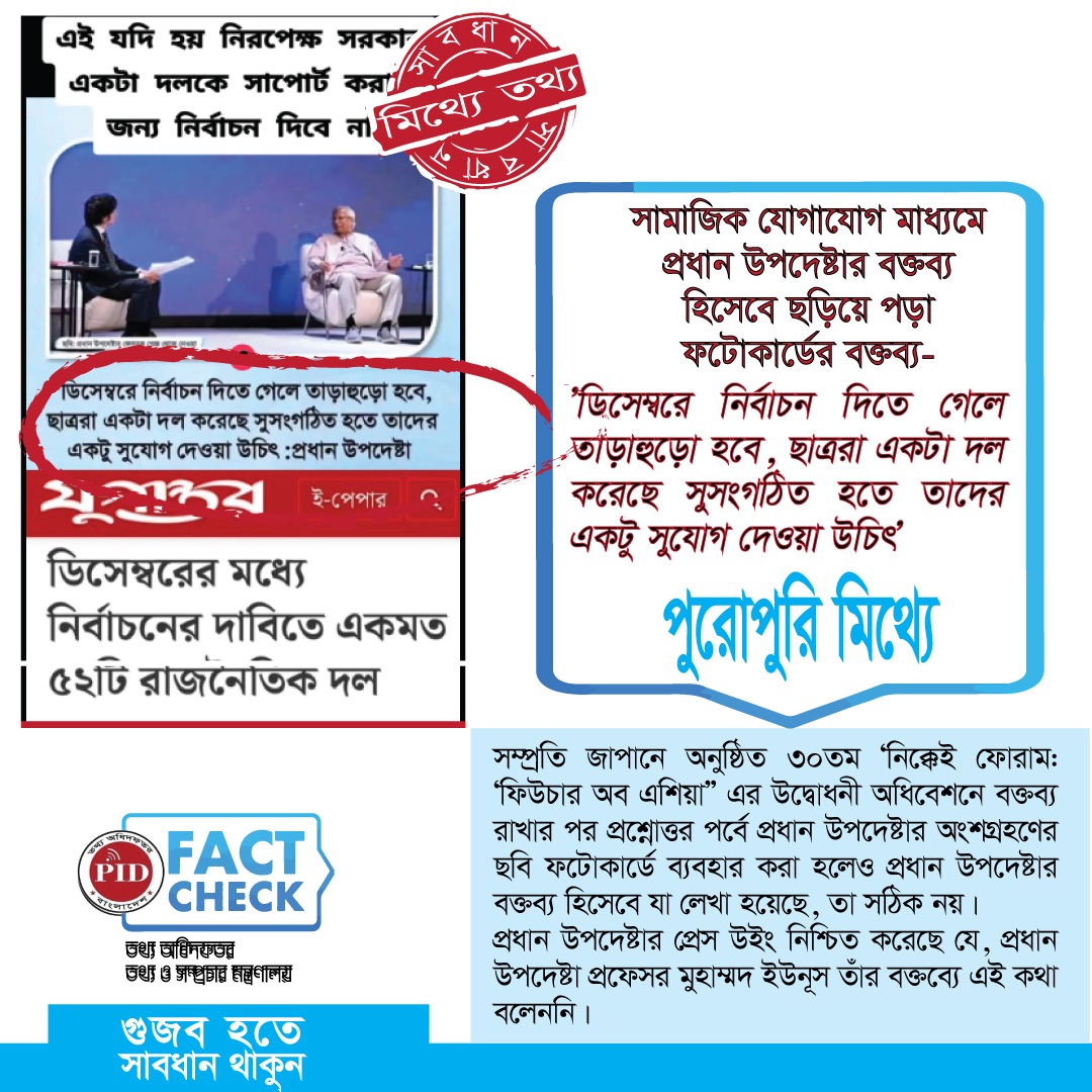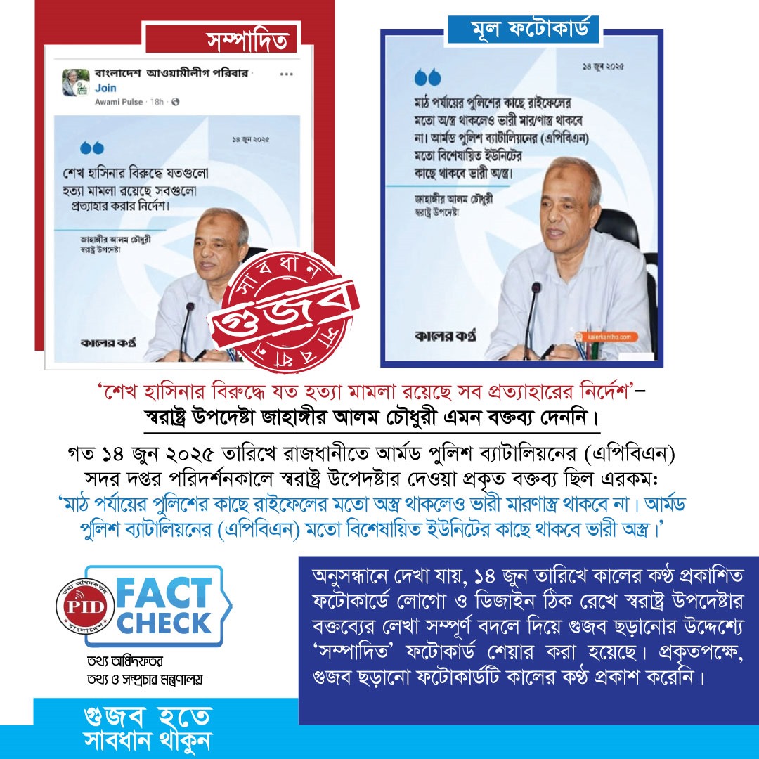 | ০১/০৬/২০২৫ | প্রধান উপদেষ্টার বক্তব্য দাবি করে প্রচারিত ভুয়া ফটোকার্ড | |