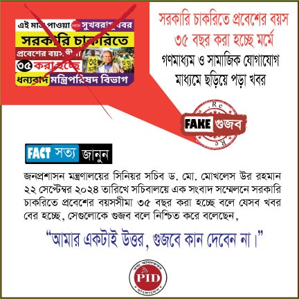 | ২৩/০৯/২০২৪ | সরকারি চাকরিতে প্রবেশের বয়স ৩৫ বছর করা হচ্ছে মর্মে গণমাধ্যম ও সামাজিক যোগাযোগ মাধ্যমে ছড়িয়ে পড়ার ব্যাপারে গুজব | |