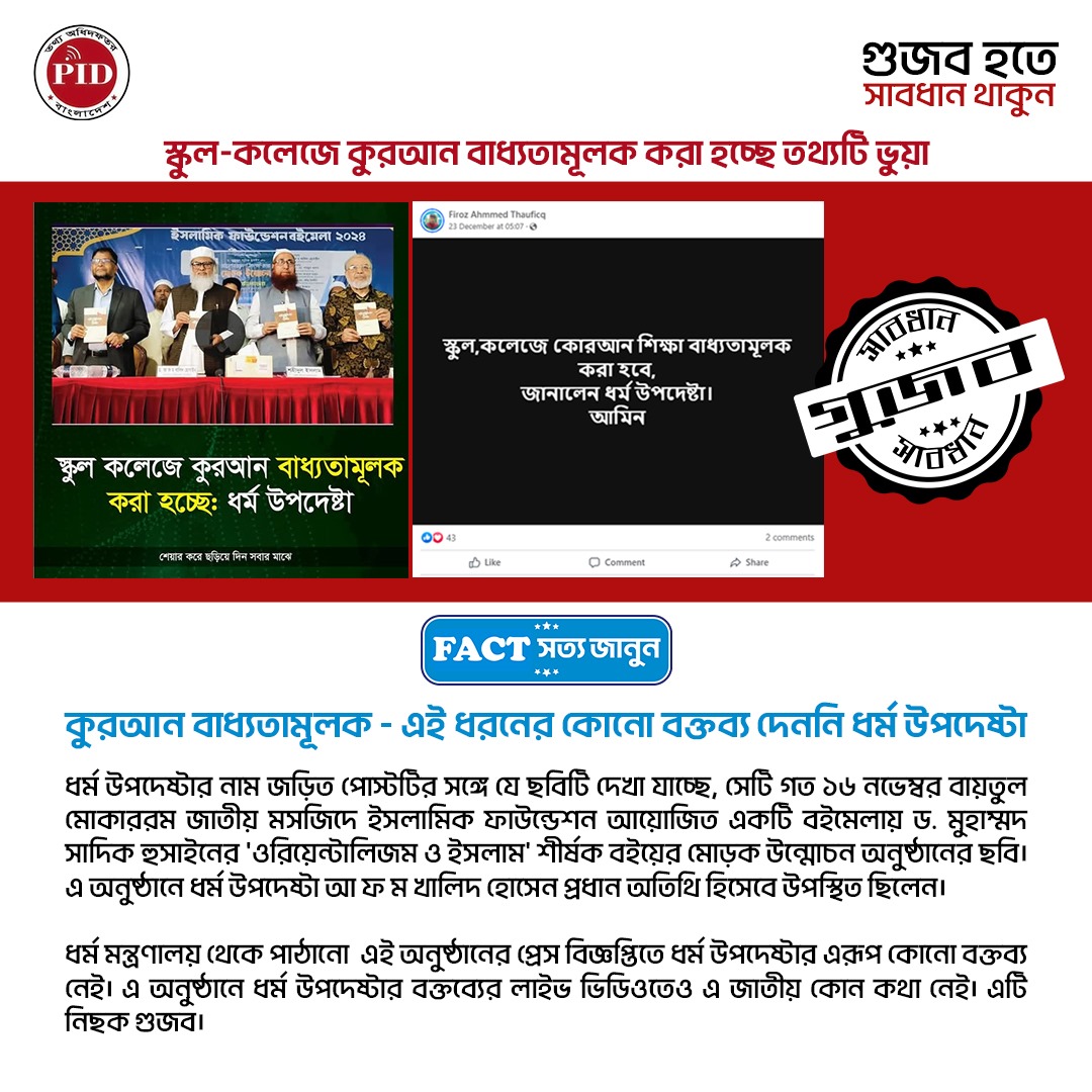 | ২৬/১২/২০২৪ | স্কুল কলেজে কুরআন বাধ্যতামূলক করা হচ্ছে' বিষয়টি গুজব | |
