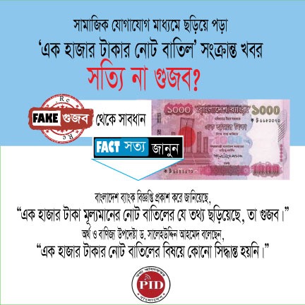 | ২১/০৮/২০২৪ | সামাজিক যোগাযোগ মাধ্যমে ছড়িয়ে পড়া ১০০০ টাকার নোট বাতিল সংক্রান্ত গুজব |