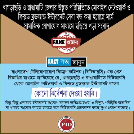 | ২২/০৯/২০২৪ | খাগরাছড়ি ও রাঙামাটি জেলার উদ্ভূত পরিস্থিতিতে মোবাইল নেটওয়ার্ক ও ফিক্সড ব্রডব্যান্ড ইন্টারনেট সেবা বন্ধ করা হয়েছে মর্মে সামাজিক যোগাযোগ মাধ্যমে গুজব | |