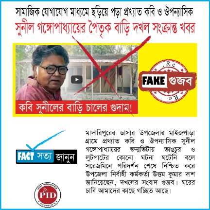 | ১২/০৯/২০২৪ | সামাজিক যোগাযোগ মাধ্যমে ছড়িয়ে পড়া প্রখ্যাত কবি ও ঔপন্যাসিক সুনীল গঙ্গোপাধ্যায়ের পৈতৃক বাড়ি দখল সংক্রান্ত গুজব | |