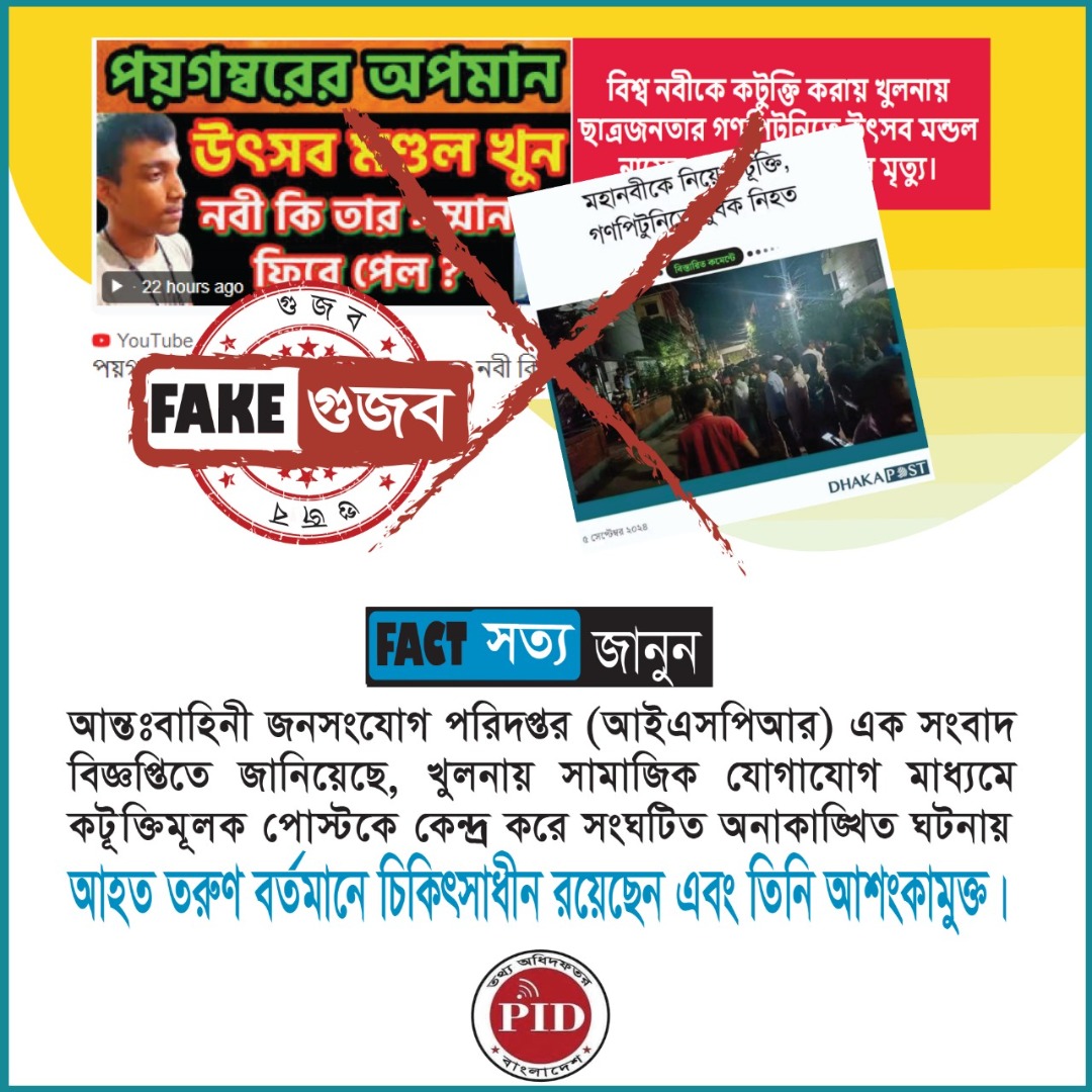 | ০৬/০৯/২০২৪ | খুলনায় সামাজিক যোগাযোগ মাধ্যমে কটূক্তিমূলক পোস্টকে কেন্দ্র করে গুজব | |