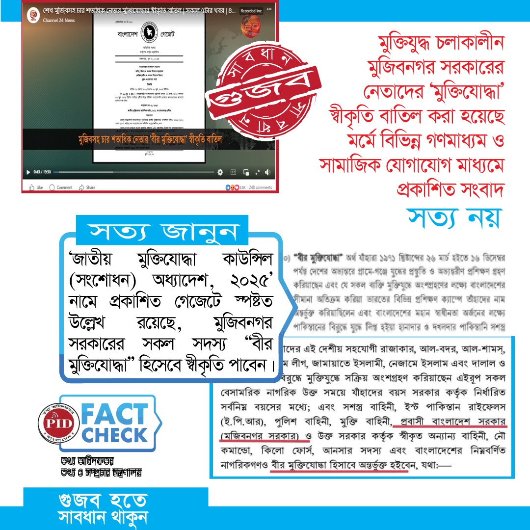 | ০৪/০৬/২০২৫ | মুক্তিযুদ্ধ চলাকালীন সরকারের মুক্তিযোদ্ধা স্বীকৃতি বাতিল হয়েছে মর্মে প্রচারিত মিথ্যা সংবাদ | |