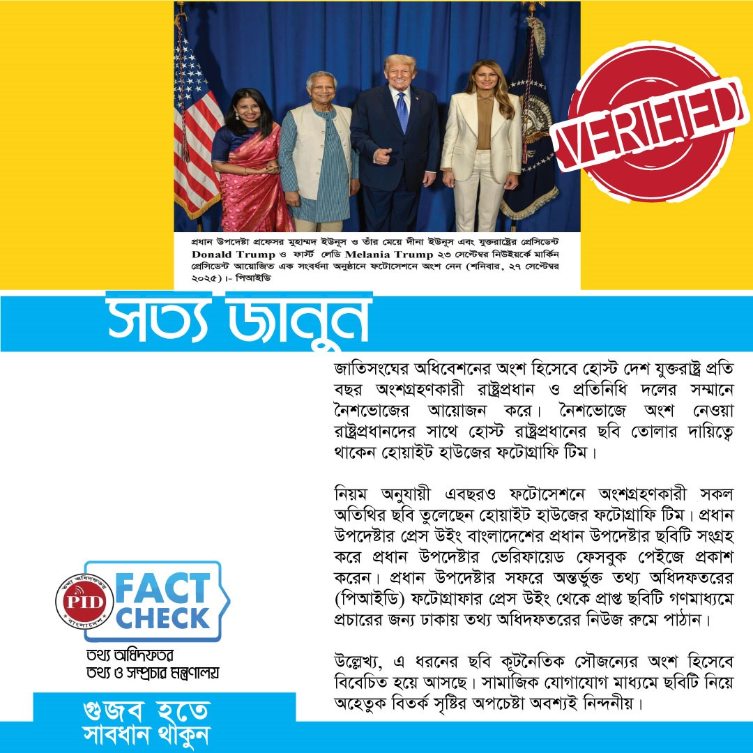 | ২৭.০৯.২০২৫ | প্রধান উপদেষ্টা প্রফেসর মুহাম্মদ ইউনুস ও তাঁর মেয়ে দীনা ইউনুস এবং যুক্তরাষ্ট্রের প্রেসিডেন্ট Donald Trump ও ফার্স্ট লেডি Melania Trump ২৩ সেপ্টেম্বর নিউইয়র্কে মার্কিন প্রেসিডেন্ট আয়োজিত সংবর্ধনা অনুষ্ঠানের ফটোসেশন ঘিরে প্রচারিত গুজব | আইকনোটেক্সট |