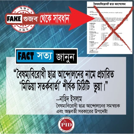 | ২৭/০৮/২০২৪ | বৈষম্যবিরোধী ছাত্র আন্দোলনের নামে প্রচারিত "মিডিয়া সতর্কবার্তা" শীর্ষক চিঠিটি ভুয়া | |