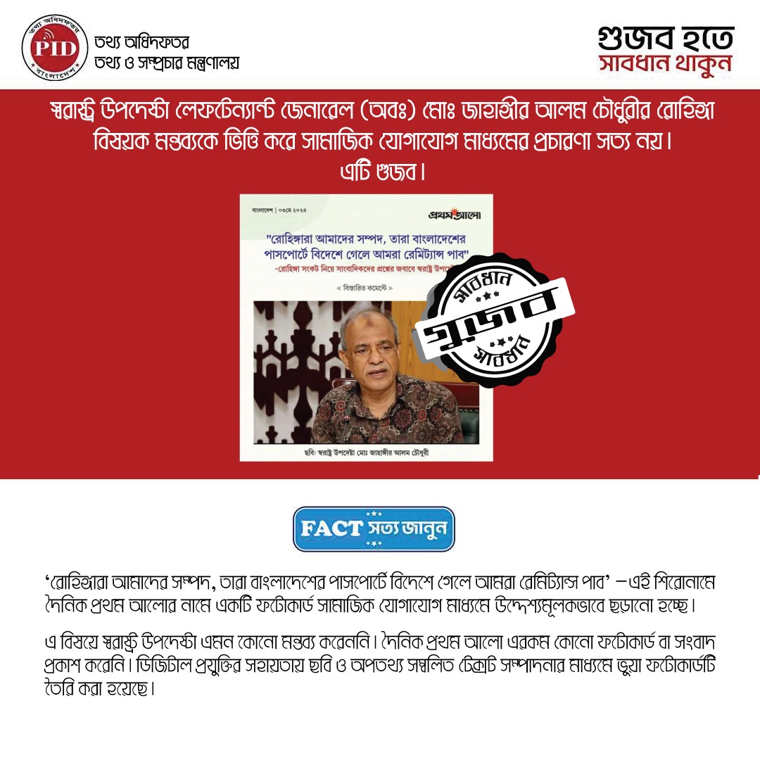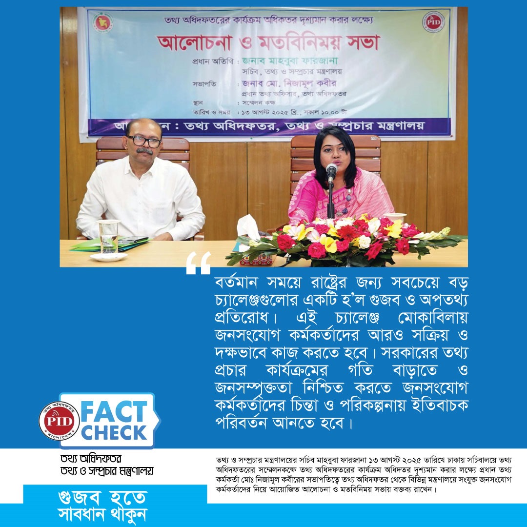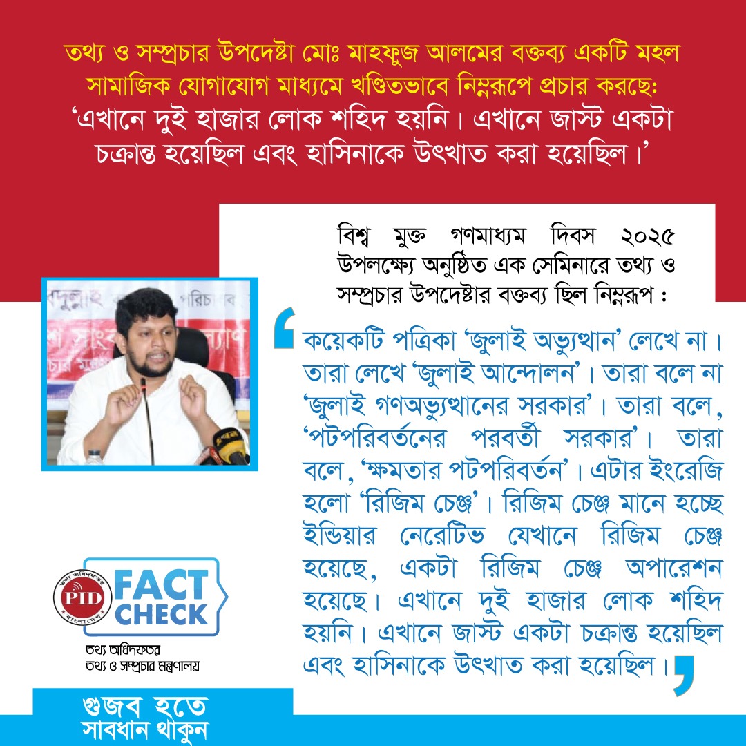 | ০৮/০৫/২০২৫ | তথ্য উপদেষ্টার বক্তব্যকে বিকৃত করে প্রচারিত গুজব | |