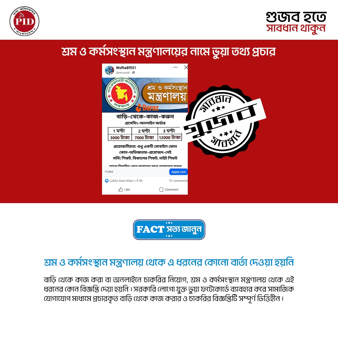 | ১২/০৩/২০২৫ | শ্রম ও কর্মসংস্থান মন্ত্রণালয়ের নামে ভুয়া তথ্য প্রচার | |