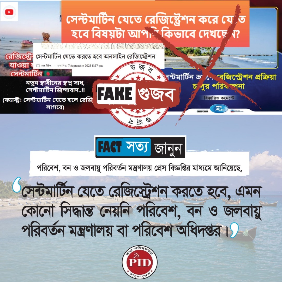 | ০৬/০৯/২০২৪ | সেন্টমার্টিন যেতে রেজিস্ট্রেশন করতে হবে- এই বিষয়ে গুজব | |