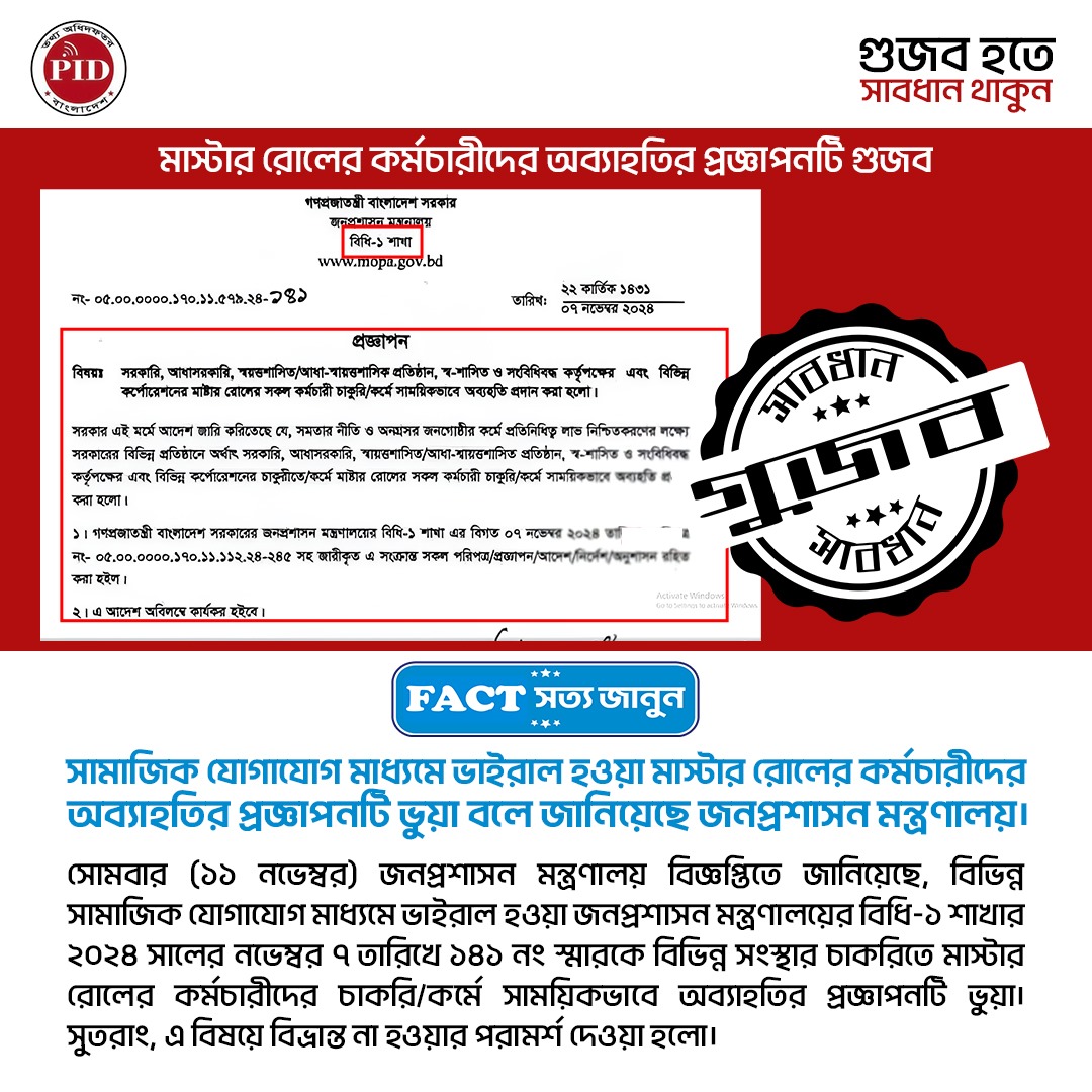 | ১২/১১/২০২৪ | মাস্টার রোলের কর্মচারীদের অব্যাহতির প্রজ্ঞাপনটি গুজব | |
