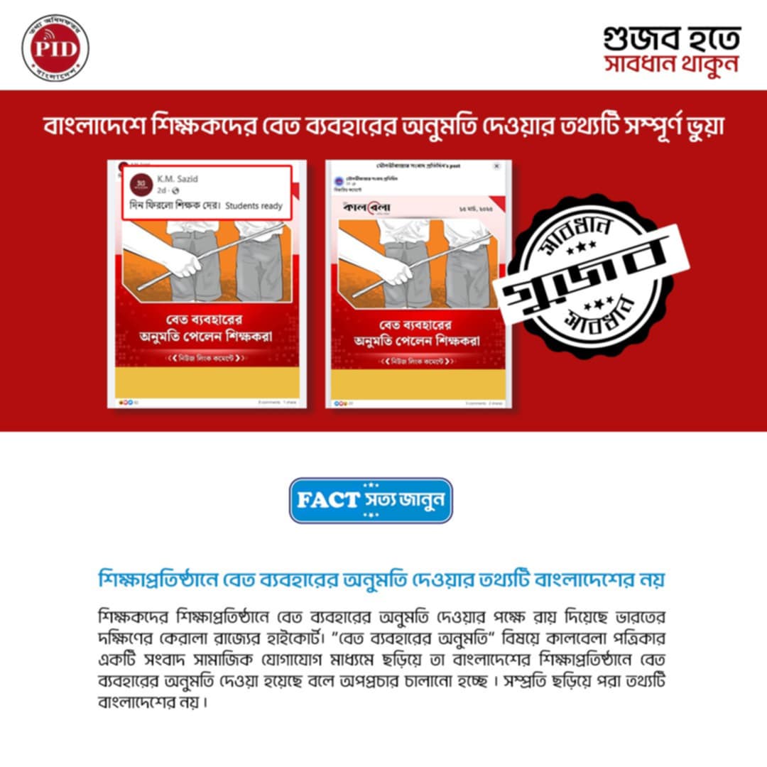 | ১৮/০৩/২০২৫ | বাংলাদেশে শিক্ষকদের বেত ব্যবহারের অনুমতি দেওয়ার খবরটি সম্পূর্ণ ভুয়া | |