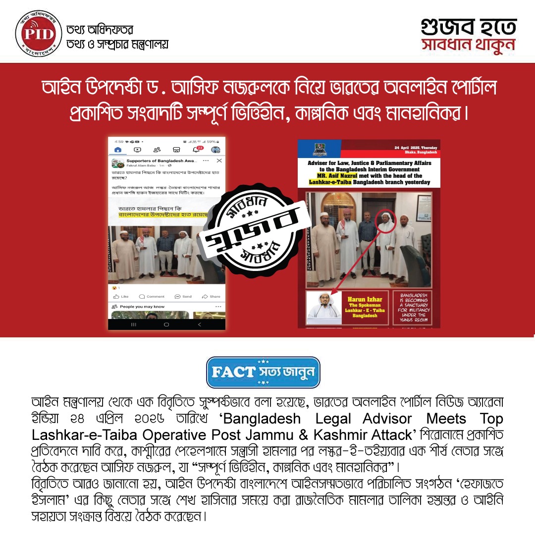 | ২৮/০৪/২০২৫ | আইন উপদেষ্টাকে জড়িয়ে ভারতীয় অনলাইন নিউজ পোর্টালে প্রকাশিত গুজব | |