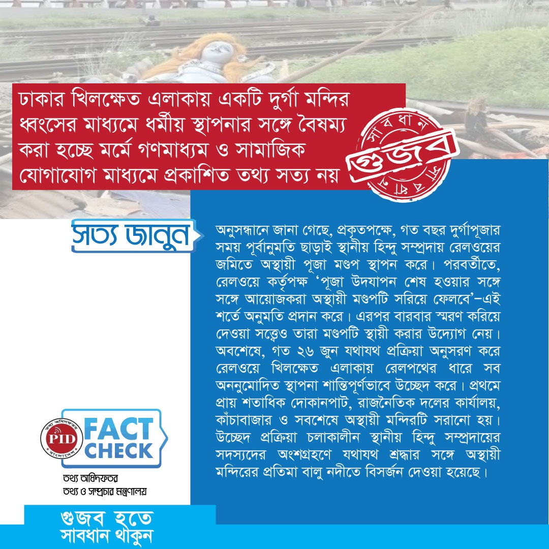 | ২৮/০৬/২০২৫ | ঢাকার খিলক্ষেত এলাকায় একটি দুর্গা মন্দির ধ্বংসের মাধ্যমে ধর্মীয় স্থাপনার সঙ্গে বৈষম্য করা হচ্ছে মর্মে গণমাধ্যম ও সামাজিক যোগাযোগ মাধ্যমে প্রকাশিত গুজব | আইকনোটেক্সট |