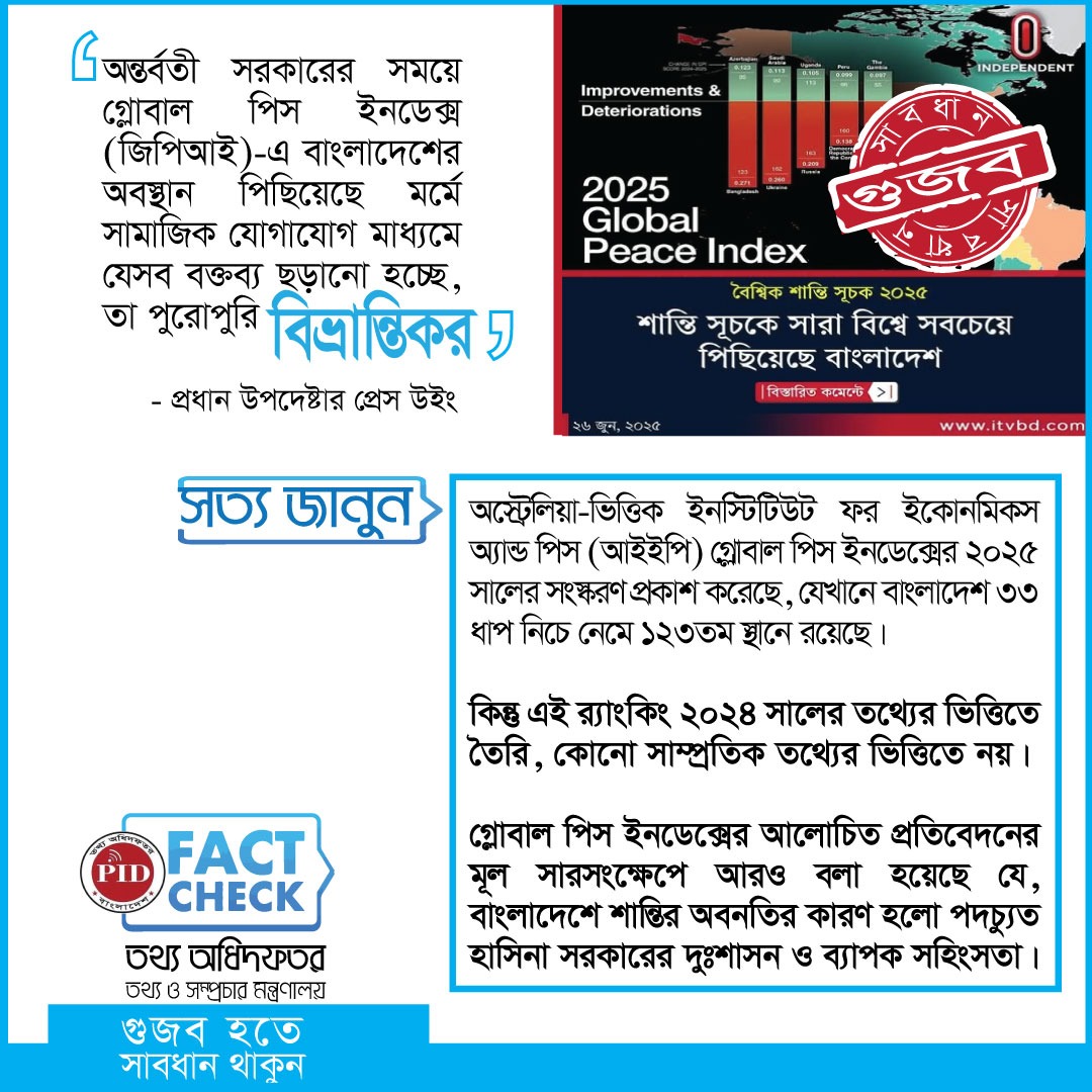 | ০১/০৭/২০২৫ | অন্তর্বর্তী সরকারের সময়ে গ্লোবাল পিস ইনডেক্স (জিপিআই)-এ বাংলাদেশের অবস্থান পিছিয়েছে মর্মে সামাজিক যোগাযোগ মাধ্যমে যেসব বক্তব্য ছড়ানো হচ্ছে, তা পুরোপুরি বিভ্রান্তিকর | আইকনোটেক্সট |