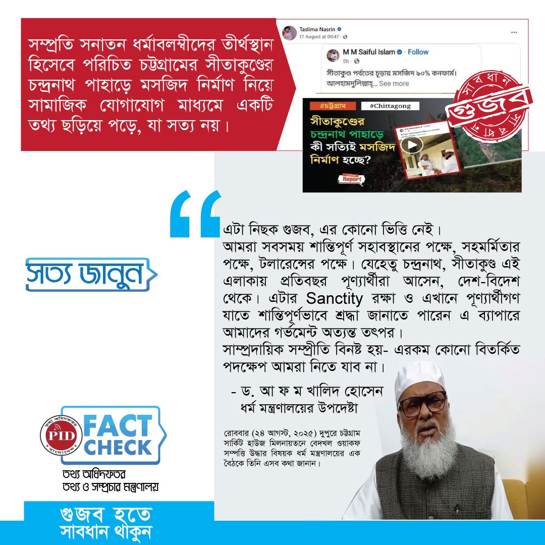 | ২৮/০৮/২০২৫ | চট্টগ্রামের সীতাকুন্ডের চন্দ্রনাথ পাহাড়ে মসজিদ নির্মাণ সংক্রান্ত গুজব | আইকনোটেক্সট |