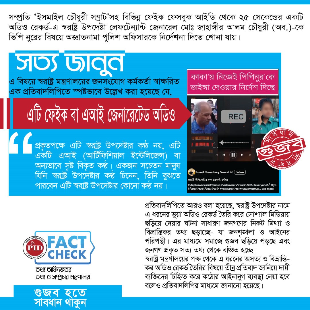 | ৩০/০৮/২০২৫ | স্বরাষ্ট্র উপদেষ্টার কণ্ঠে ফেইক এ আই জেনারেটেড অডিও প্রচার সংক্রান্ত গুজব | আইকনোটেক্সট |