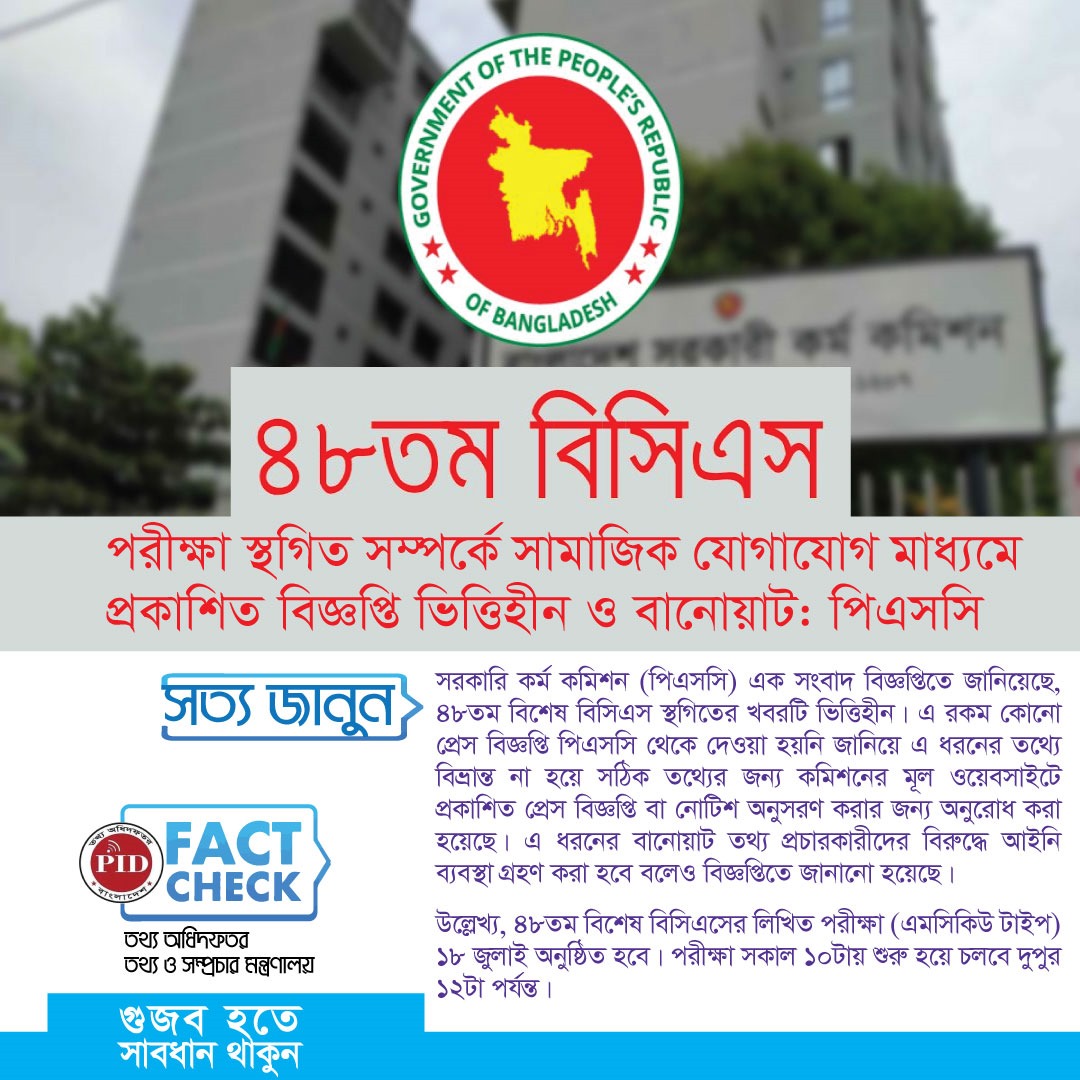 | ১৭/০৭/২০২৫ | ৪৮ তম বিসিএস পরীক্ষা স্থগিত সম্পর্কে সামাজিক যোগাযোগ মাধ্যমে প্রকাশিত বিজ্ঞপ্তি ভিত্তিহীন ও বানোয়াট। | আইকনোটেক্সট |